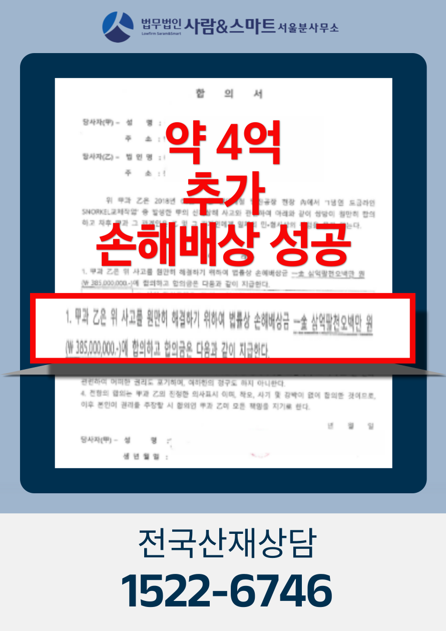산재 보상과 별도로 약 4억 원 규모의 근재보험 손해배상이 검토·합의된 사례입니다.